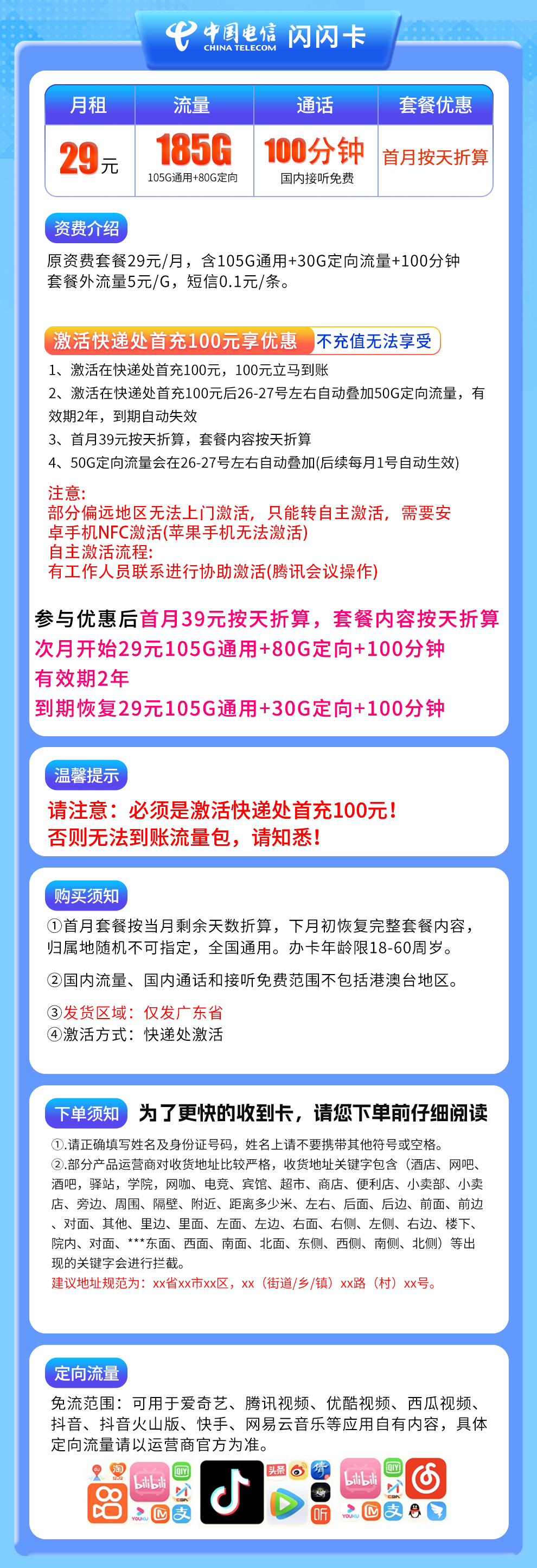 - 电信闪闪卡:29元月租,包含185G流量和100分钟通话,仅限广东地区办理。