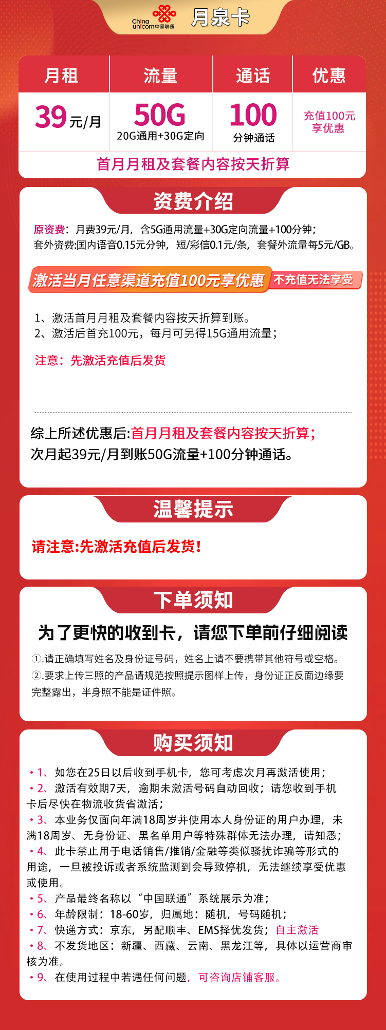 - **激活要求**:先充值100元再发货,不充值无法享受优惠