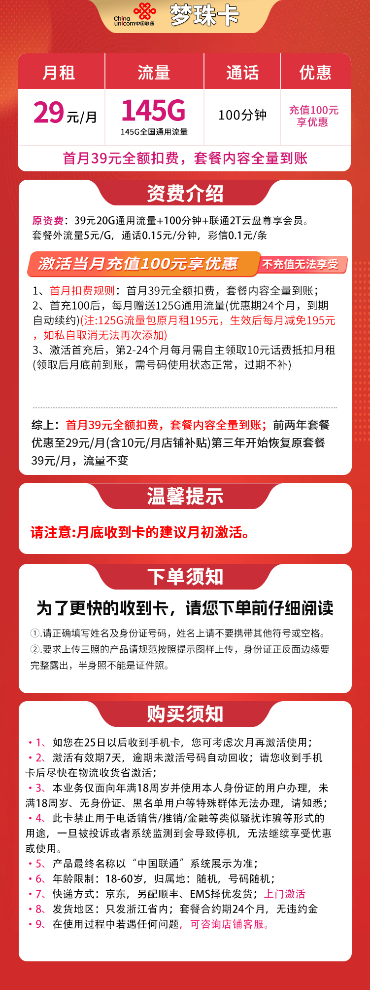 联通梦珠卡:29元月租,含145G省内流量和100分钟通话,适合省内使用。