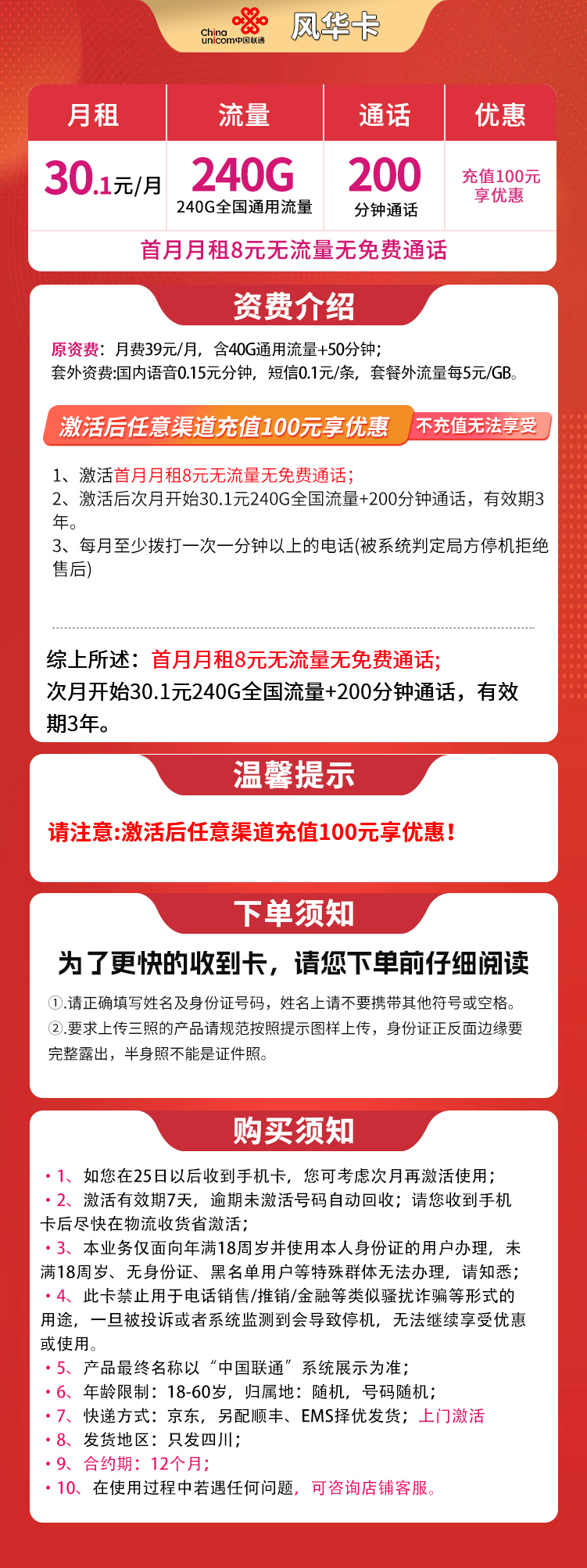 - 联通风华卡,30.1元月租,含240G全国流量和200分钟通话,有效期3年。首月月租8元无流量和通话。需激活后充值100元才能享受优惠,且每月需至少拨打一次一分钟以上电话,否则可能被停机。