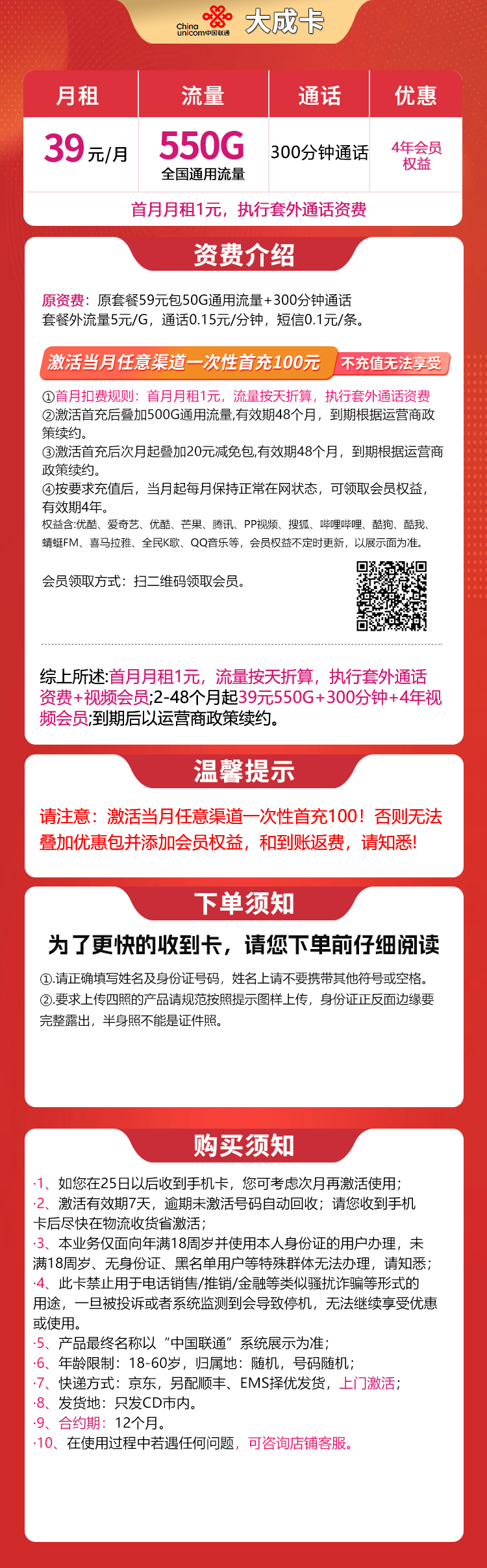 - 联通大成卡:月费39元,包含550G通用流量和300分钟通话(仅限市内使用)。