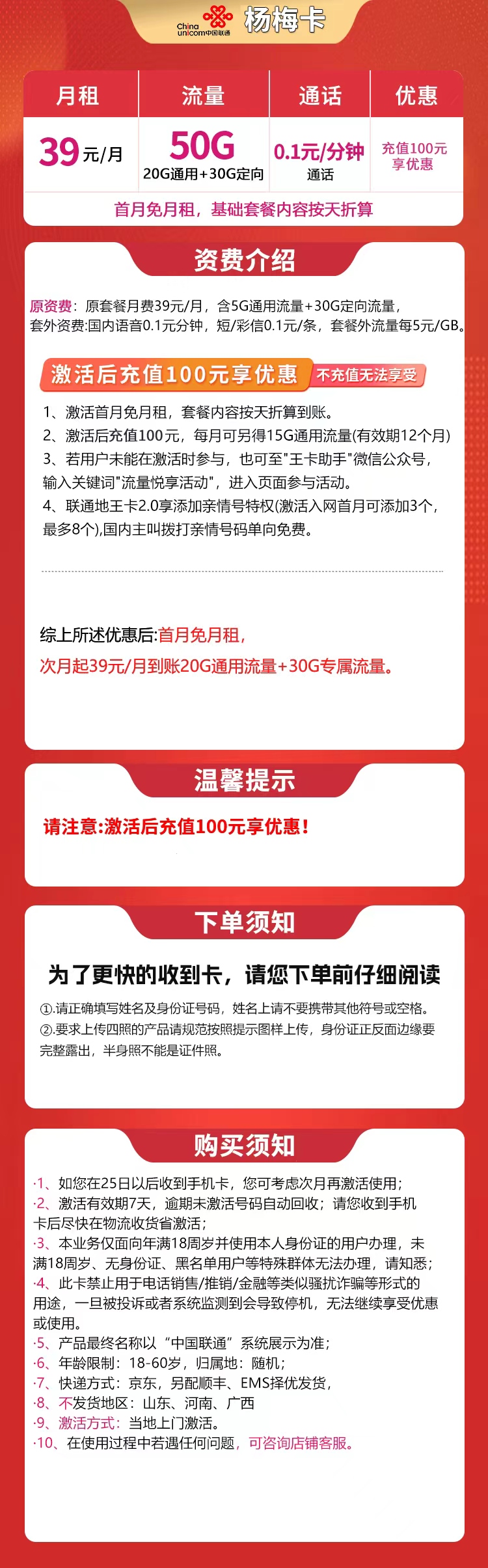 联通杨梅卡39元50G【发全国】