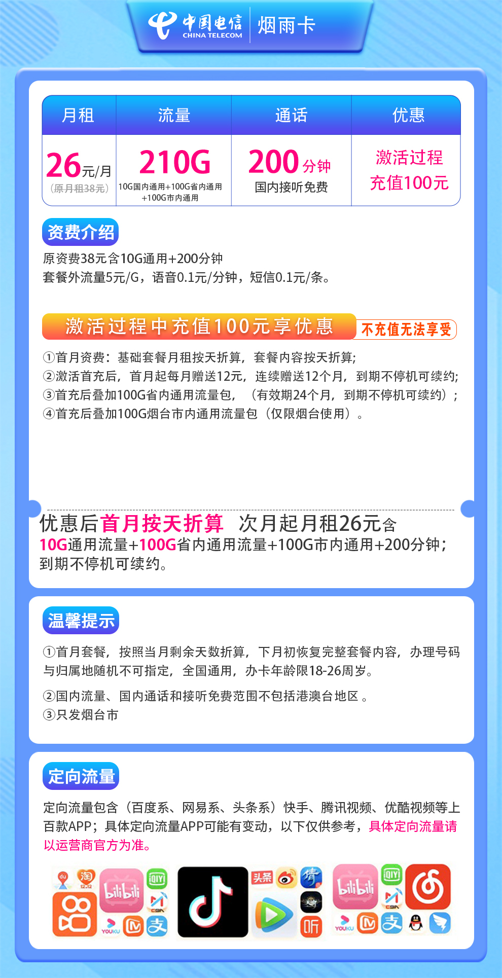 - 电信烟雨卡:26元月租,包含210GB流量和200分钟通话,仅限烟台地区办理。