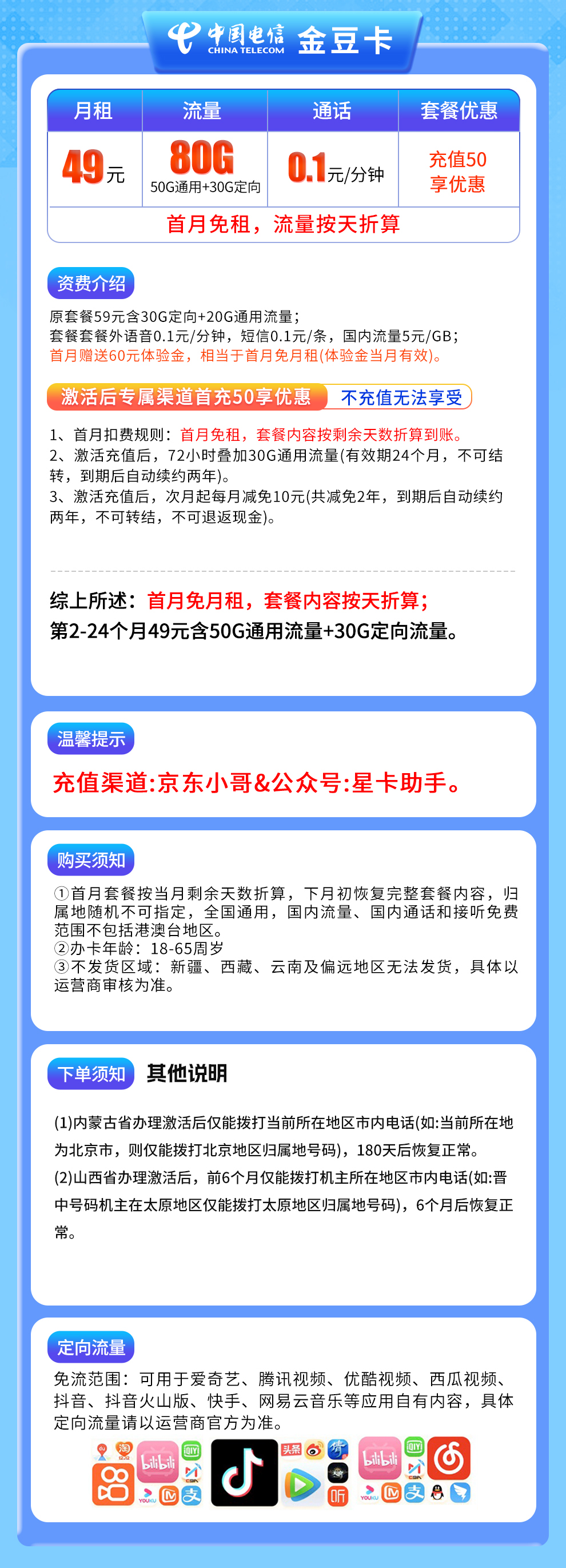 - 电信金豆卡:49元月租,含80G全国通用流量,适合需要大流量的用户。