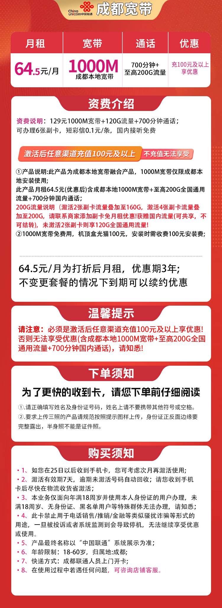 - 成都套餐:64.5元/月,含1000M宽带、200G流量、700分钟通话。