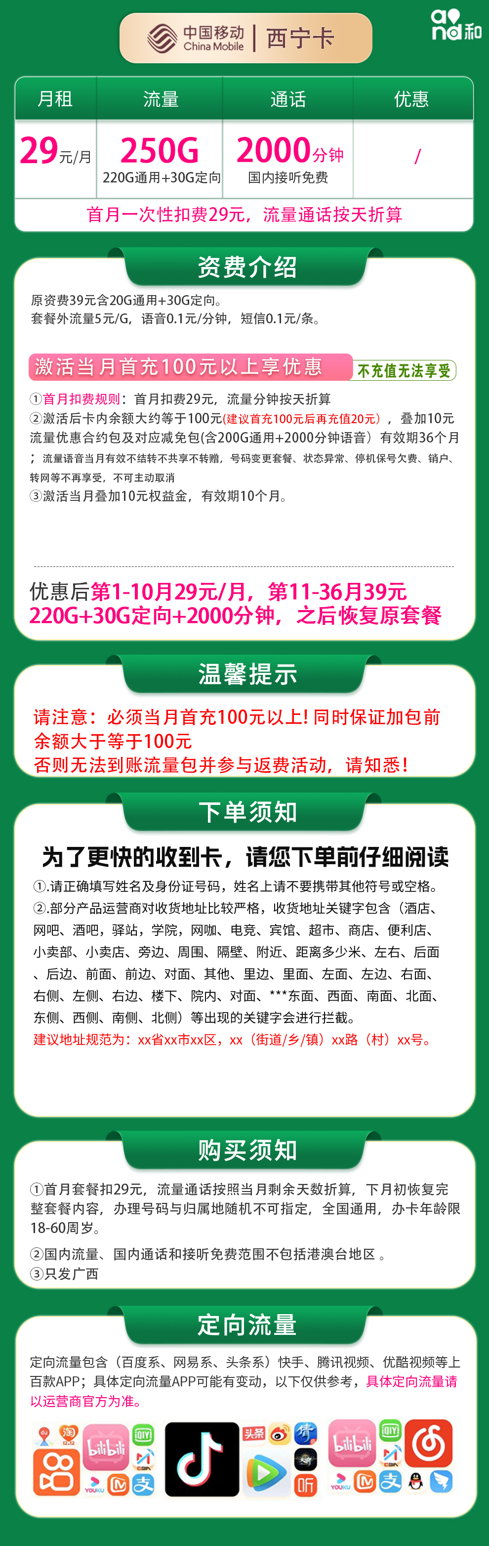 - 移动西宁卡:29元月租,包含250G流量和2000分钟通话,仅限广西地区办理。