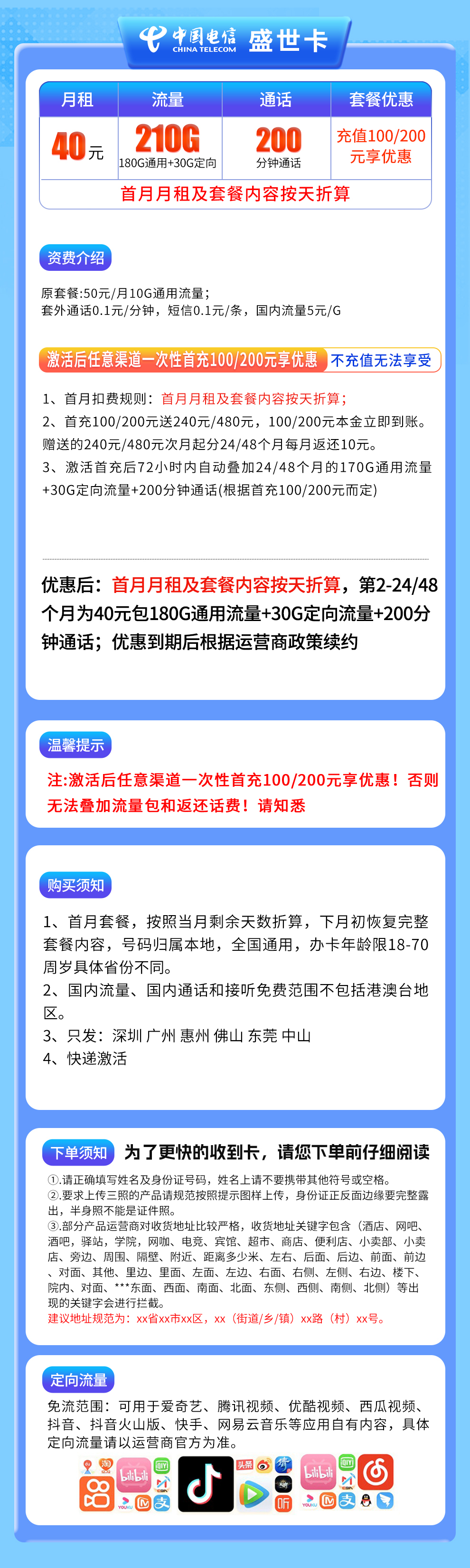 3. 激活首充后72小时内自动叠加24/48个且的170G通用流量+30G定向流量+200分钟通话(根据首充100/200元而定)