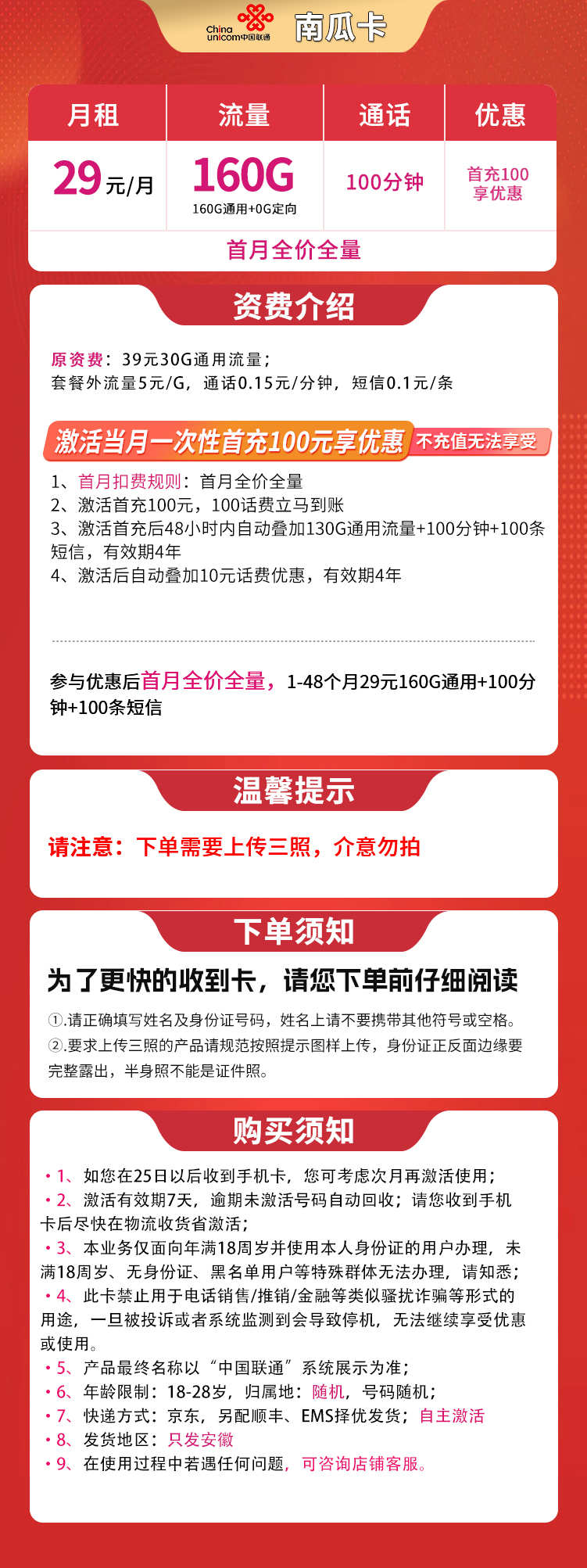 - 安徽联通南瓜卡:29元月租,含160G通用流量+100分钟通话+100条短信,优惠期4年。需首充100元激活优惠。