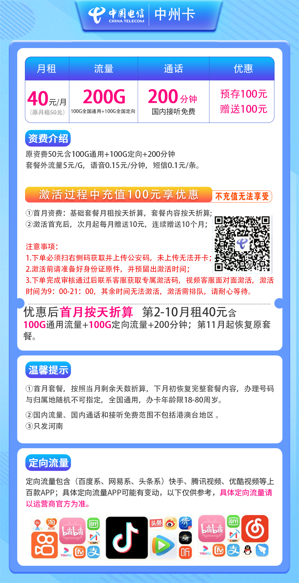 - 河南电信卡,40元月租,含200G流量(100G通用+100G定向)和200分钟通话,仅限河南使用。