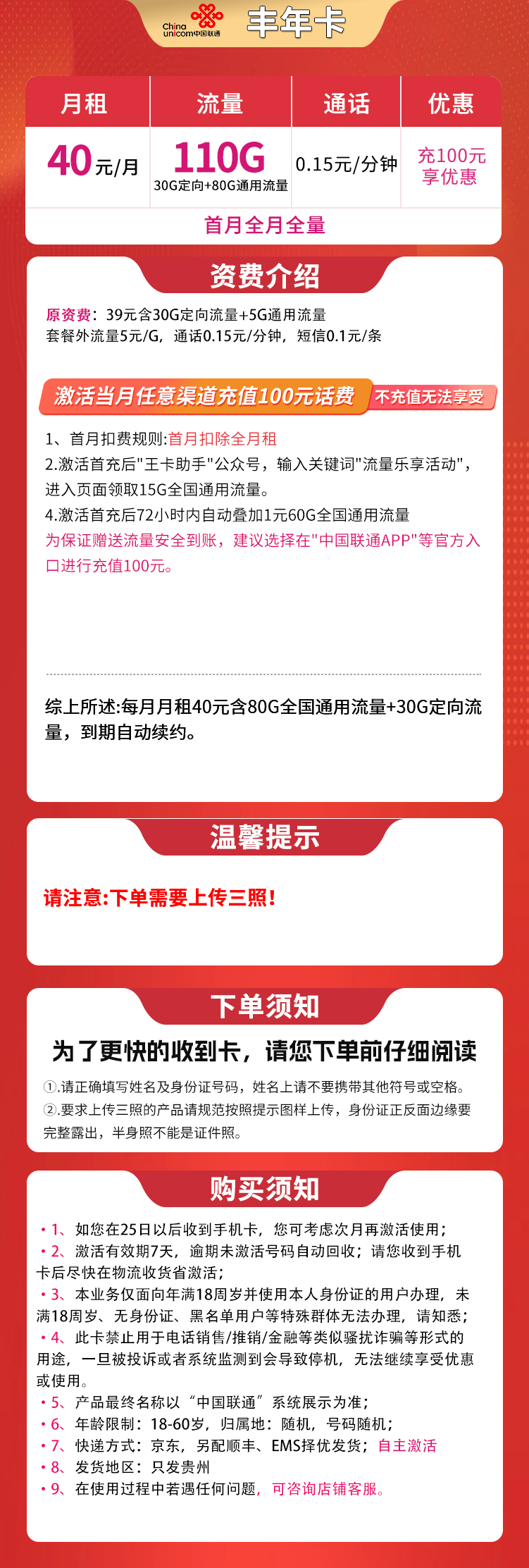 联通丰年卡40元110G【只发贵州】