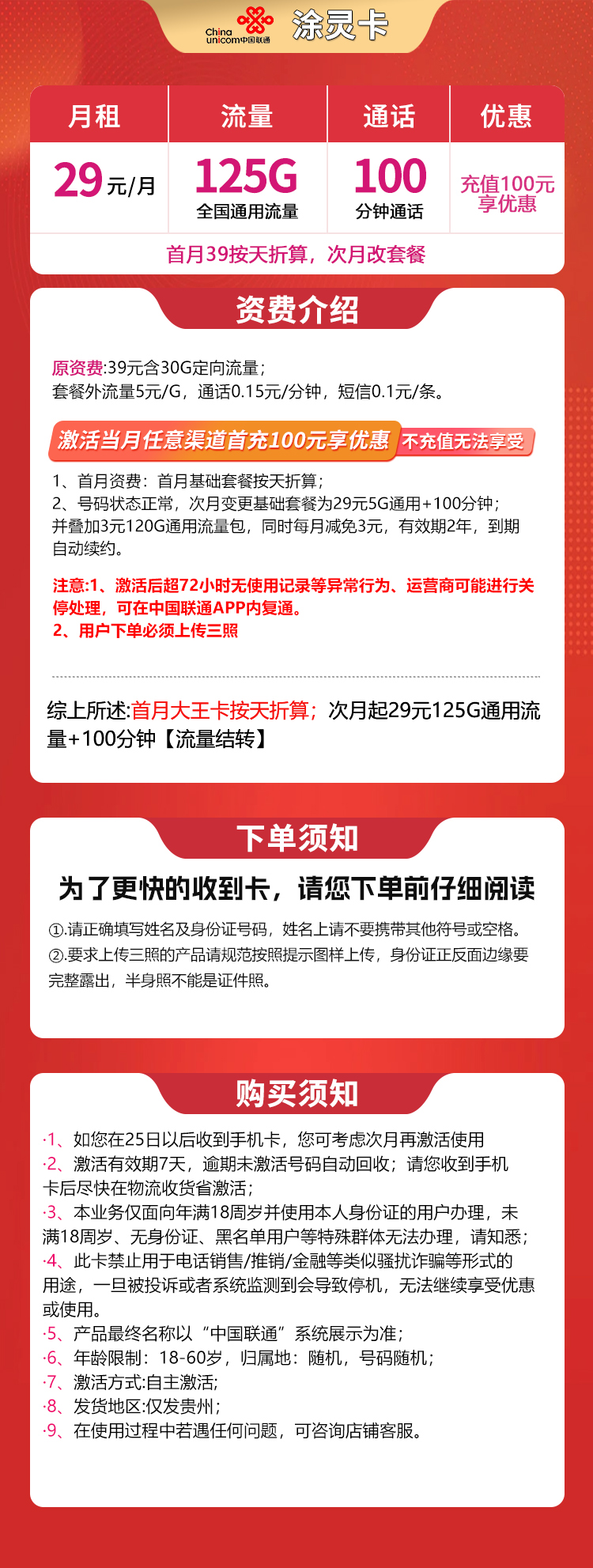 - 贵州联通涂灵卡,29元套餐含125G通用流量+100分钟通话,限贵州地区办理。
