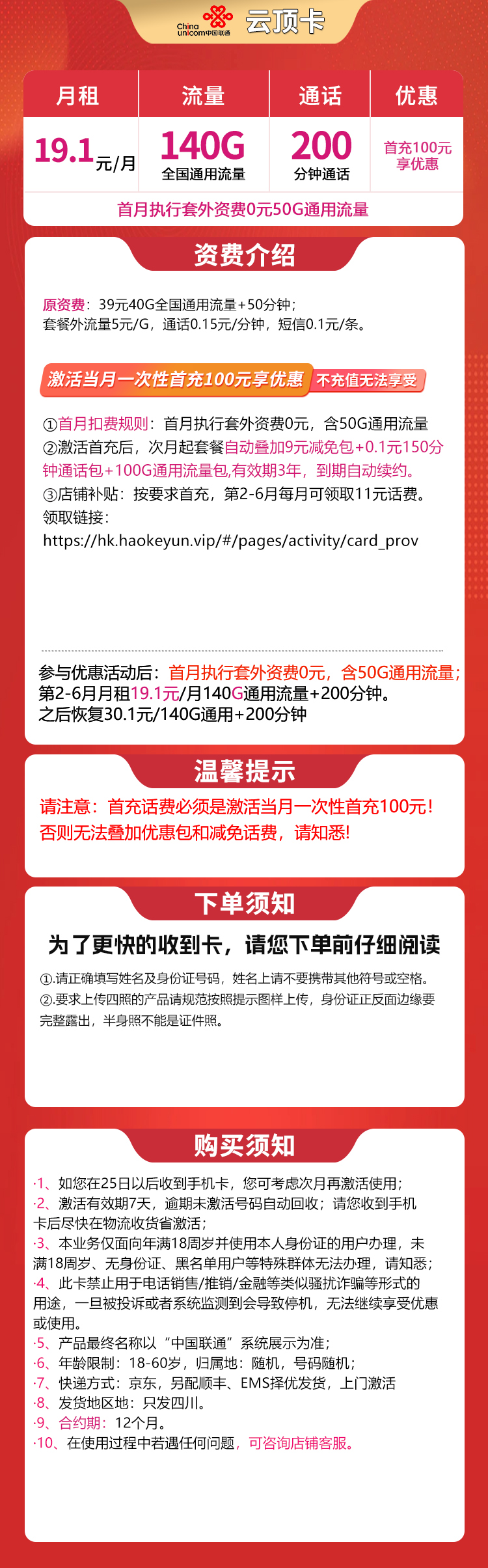 联通云顶卡19.1元140G+200分钟【只发四川】