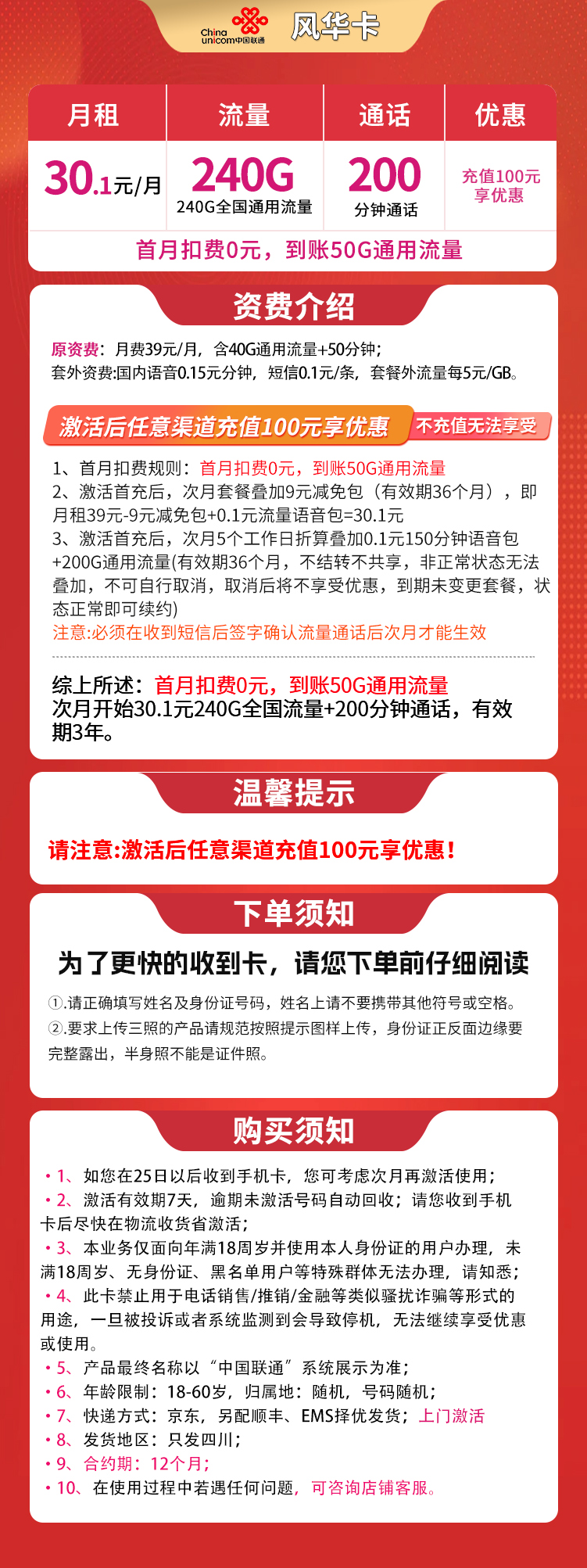 G2联通风华卡30.1元240G+200分钟【只发四川】