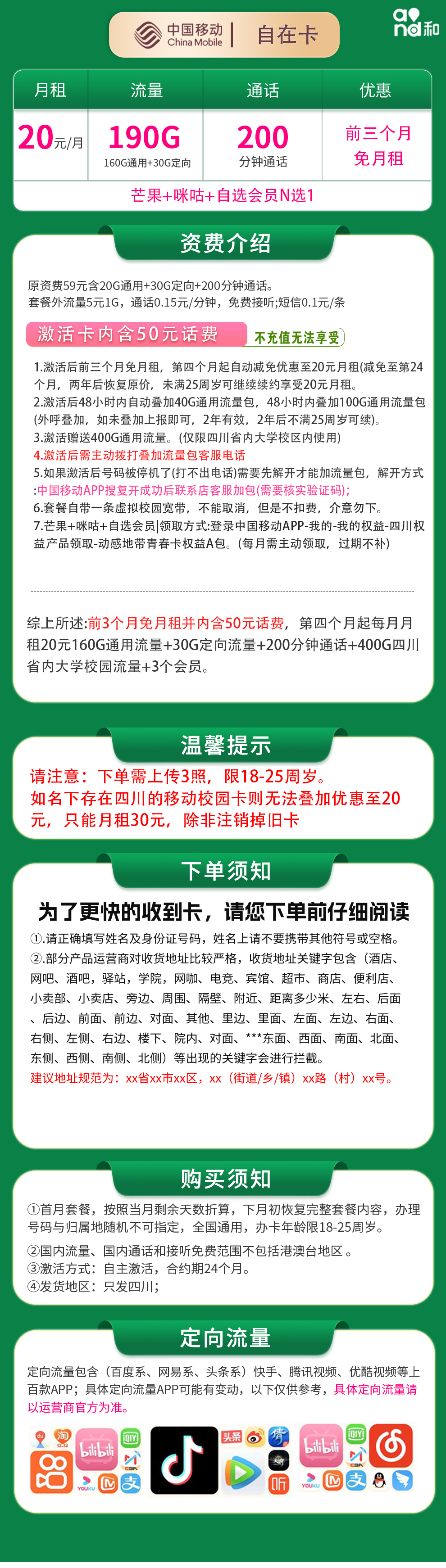 - 移动自在卡20元套餐(仅限四川):