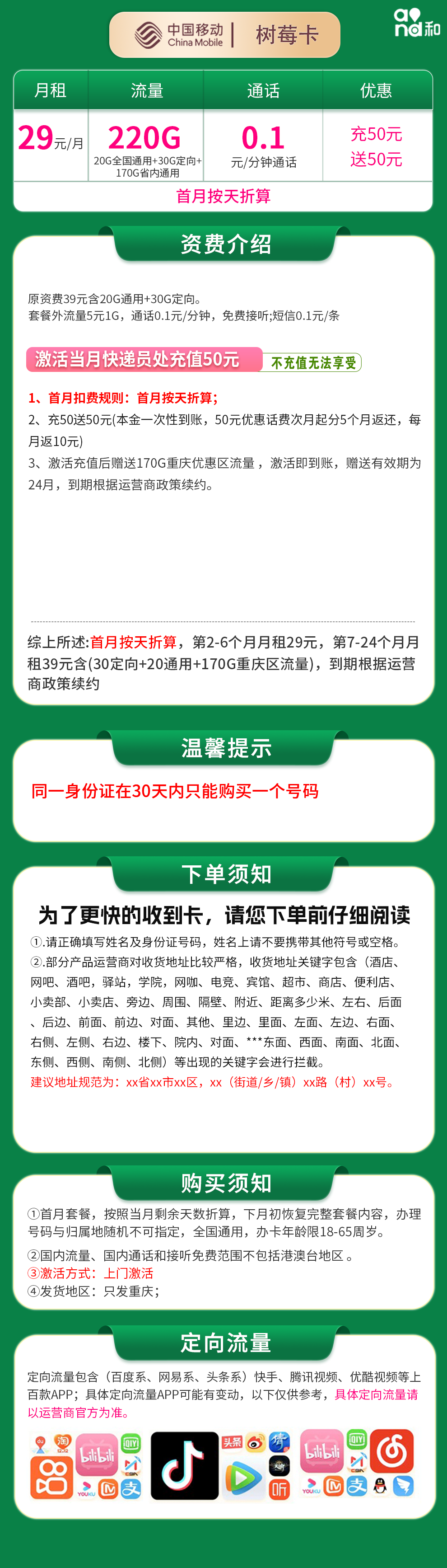 - 重庆专属移动树莓卡:月租29元,包含220G流量。