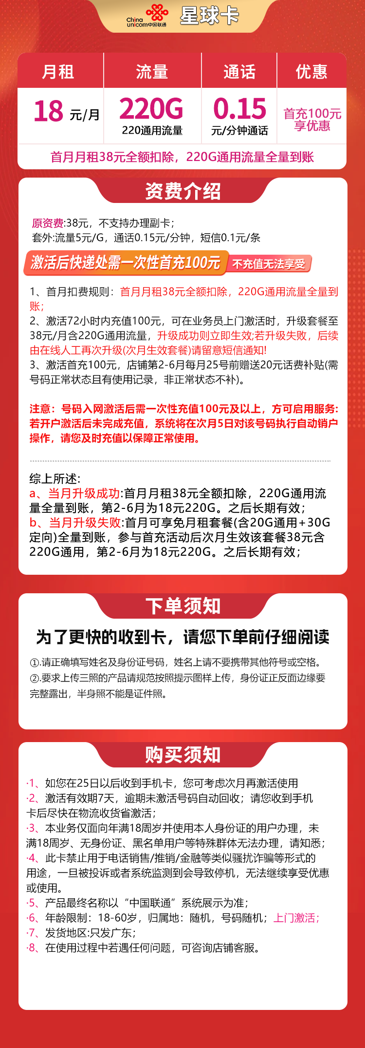 - 广东联通星球卡,月租18元享220G通用流量,需注意以下几点: