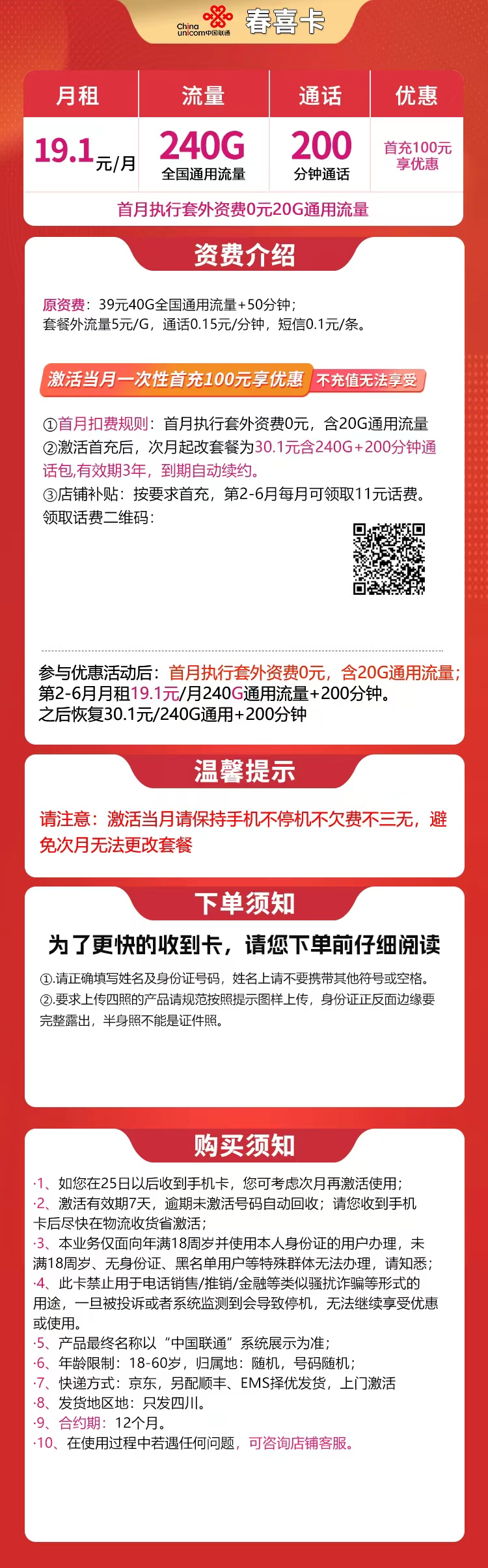 2,激活首充后,次月起改套餐为30.1元含240G+200分钟通话包,有效期3年,到期自动续约。
