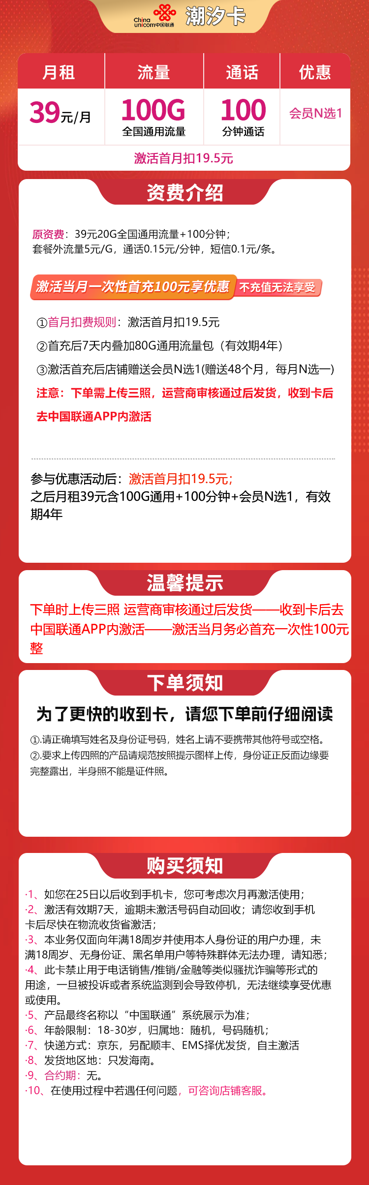 - 联通潮汐卡:39元月租,含100G流量和100分钟通话,仅限海南地区办理。